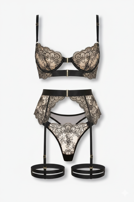 Turn heads with the Little Nooks 3 Piece Lingerie Sets Collection — the ultimate in feminine confidence and timeless allure. Each set includes a matching bra, panty, and suspender belt, designed to create a complete look that feels as empowering as it is captivating.