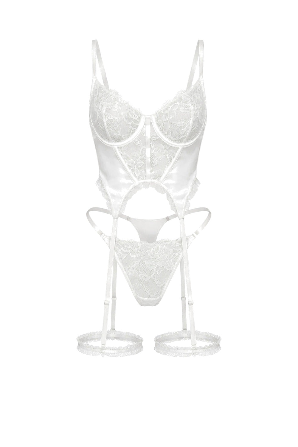 Turn heads in Freya, a dreamy white basque set made for soft silhouettes and confident moments. Featuring sheer floral lace cups with supportive underwire, this set sculpts the waist with smooth satin-look panels and a flattering pointed hem. Finished with adjustable suspender straps and matching thigh garters, Freya is equal parts romantic and bold.