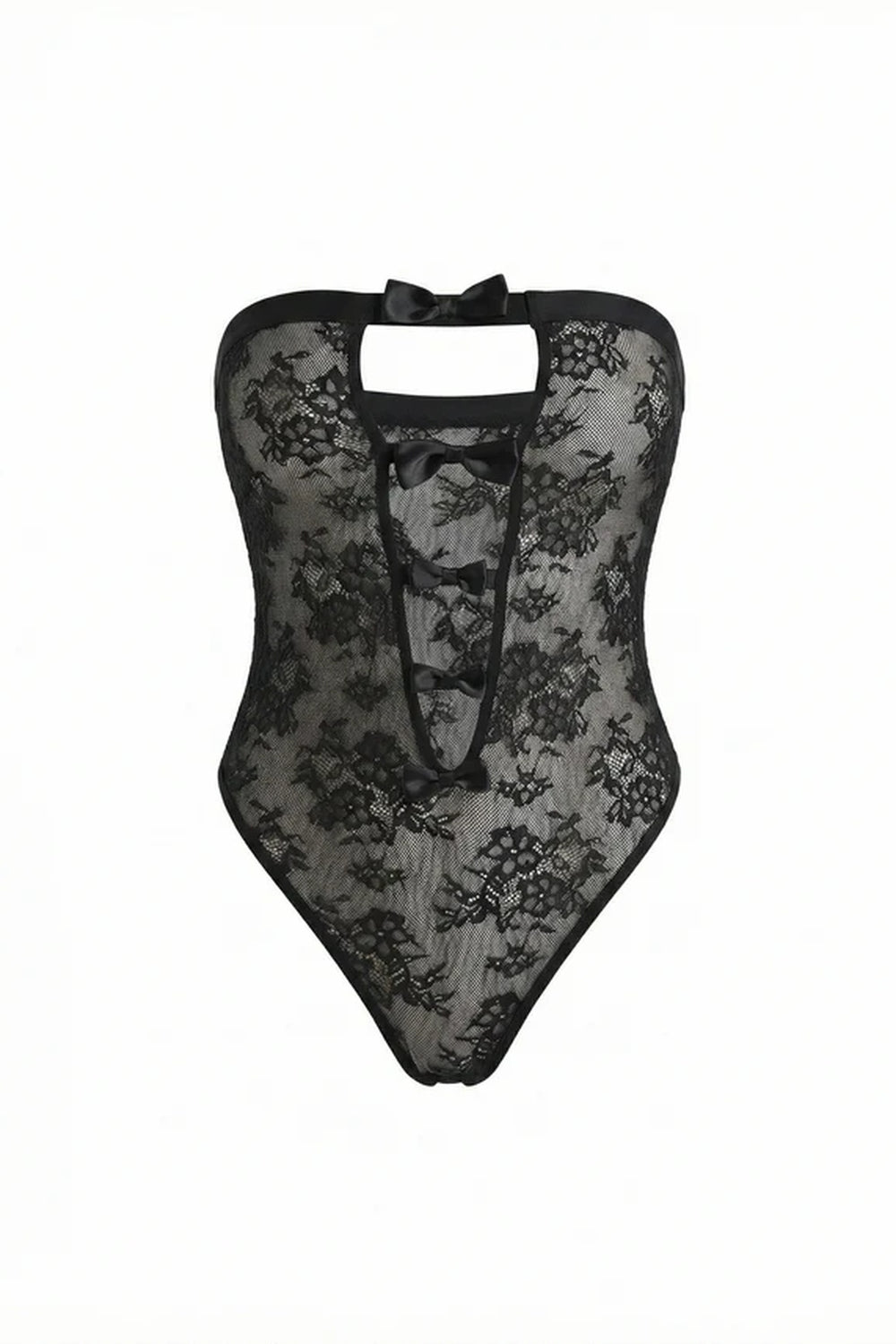 Sabrina — a show-stopping strapless black bodysuit that’s all about bold, barely-there drama. Crafted in sheer mesh with delicate lace detailing, it features a striking front cut-out ladder finished with satin bow trims for a playful, ultra-flattering finish. The high-leg cut elongates the silhouette, while the thong-style back keeps the look seamless and undeniably sexy.