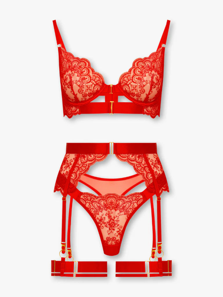 Ignite your confidence with the Nicola Lingerie Set In Red, a sultry three-piece that’s equal parts elegance and seduction. Crafted from luxurious floral lace with intricate embroidery, this set is designed to flatter and entice. The decorative straps with gold-tone hardware add a bold, glamorous edge, while the matching bra, thong, and adjustable suspender belt complete the look.